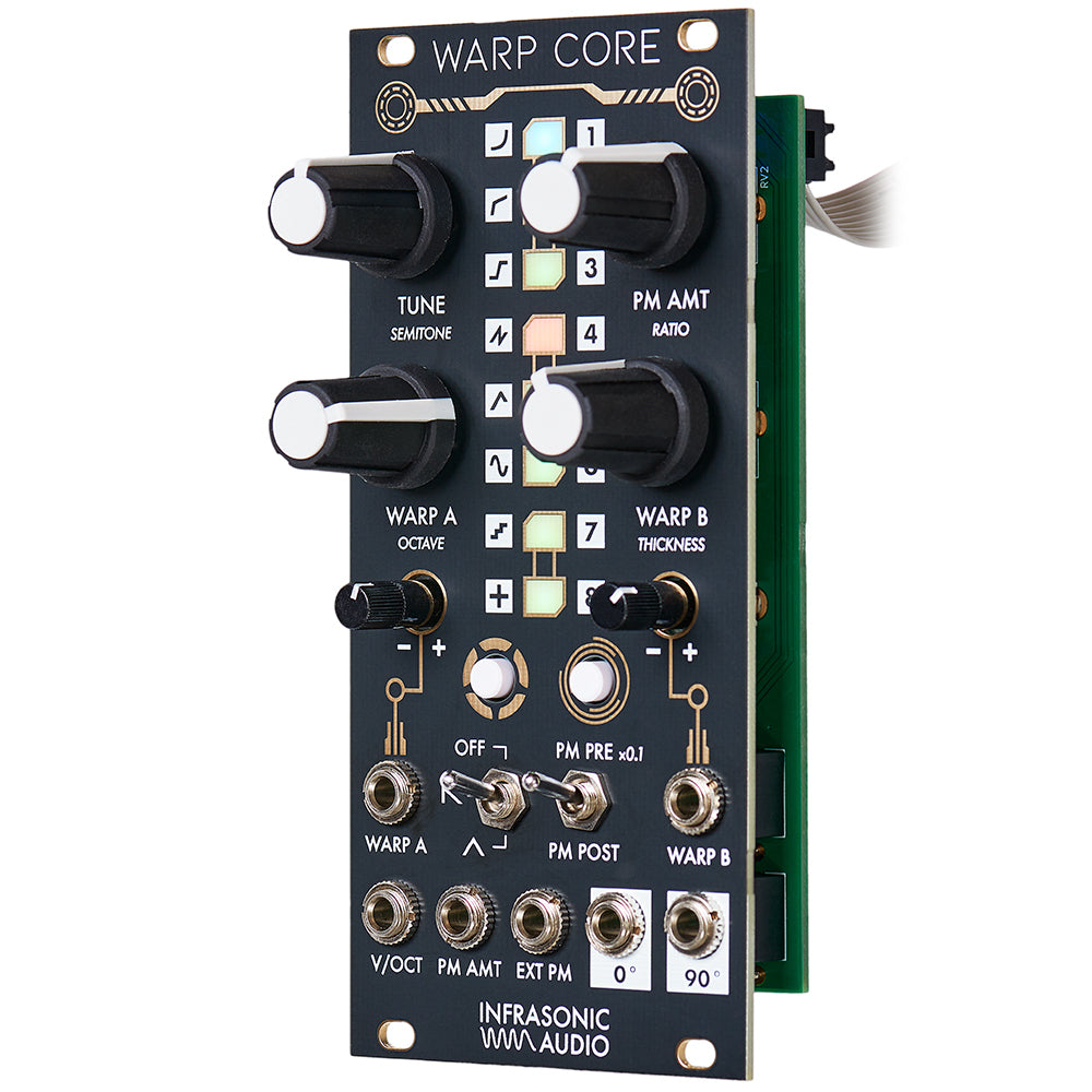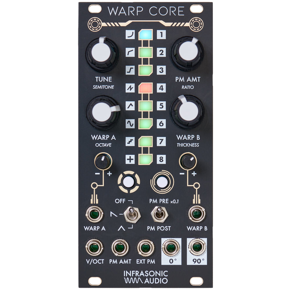 Warp Core is a complex stereo oscillator for the Eurorack modular synthesizer format, designed for deep and uniquely digital timbral exploration. Unlike traditional oscillators, Warp Core does not produce perfect geometric wave shapes (triangle, saw, square, etc), but instead uses a digital synthesis technique called phase distortion to produce variably complex waveforms with rich harmonic content from a pure sine wave lookup table.